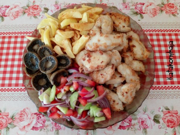 Elkészítése: a csirkemellfilét felszeleteljük, sózzuk, borsozzuk, fokhagymatörővel nyomunk rá 2 gerezd fokhagymát állni hagyjuk (hűtőben) A gombát megtisztítjuk, sózzuk. A salátához összevágjuk a zöldségeket. Burgonyát megtisztítjuk, hasábokra vágjuk, megsütjük. Közben a csirkehusit lisztben megforgatjuk, kevés olajba megsütjük a szeleteket. Másik serpenyőbe szintén teszünk olajat és ebbe megsütjük a gombákat. Ha mindent kisütöttünk tálaljuk tetszés szerint. A salátát picit sózzuk és csurgatunk rá olivaolajat, de akár salátaöntettel is meglocsolhatjuk.