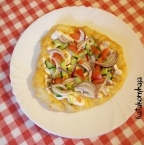 Elkészítése: A langyos cukros tejben felfuttatom az élesztőt, a lisztbe rakok 4 kávéskanál sót (összekeverem), a joghurtot. Ha felfutott az élesztő hozzáadom a lisztes joghurthoz majd annyi langyos vizet adok hozzá, hogy egy galuskatésztától keményebb kicsit ragacsos tésztát kapjak (én fakanállal szoktam kikavarni). A tésztát beteszem a hűtőbe legalább egy órára, de előző nap is elkészíthetjük, közben elkészítem a fokhagymás tejfölt (fokhagymát összenyomjuk,csipet só majd összekavarom a tejföllel) összedarabolom a FF lapockát (tarját) ,zöldségeket . A megkelt tésztát jól lisztezett nyújtótáblára borítjuk, kézzel széthúzgáljuk, kiszaggatjuk, még letakarjuk fél órát kelesztjük, széthúzgáljuk, forró olajba aranysárgára sütjük. Ízlés szerint teszünk rá tejfölt, sajtot egyéb feltétet stb.