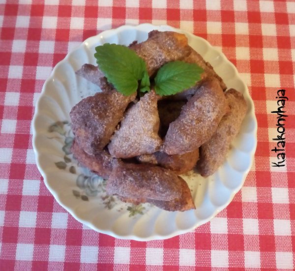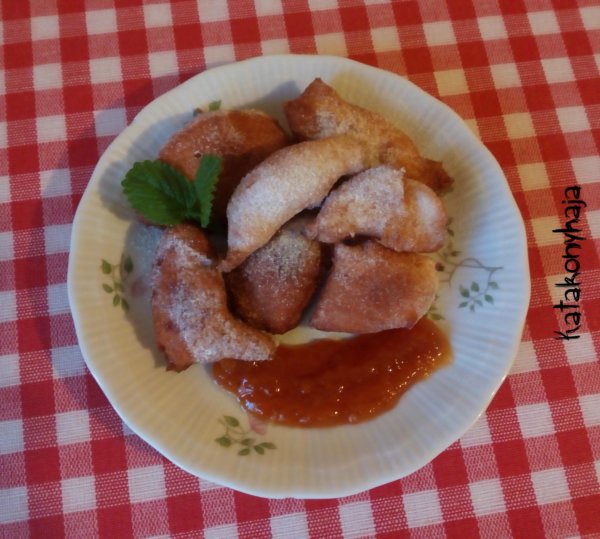 A mai desszert nem igazán aktuális, ördögfánkot készítettem. Egyszerűen a forró olajba szaggatom kanállal a tésztát, kisütöm és megforgatom kakaós porcukorban.