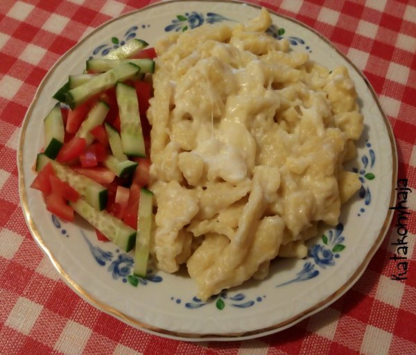 Elkészítése: A lisztből a tojással, 10 dkg reszelt sajttal, kevés vízzel galuskatésztát keverünk. Forró vízbe szaggatjuk, kifőzzük és leszűrve 2-3 evőkanál olajba forgatjuk. A forró galuskára szórjuk a 10 dkg reszelt sajtot forrón tálaljuk, salátával.