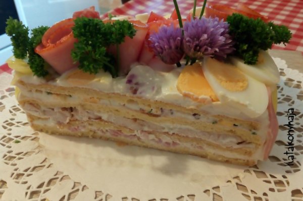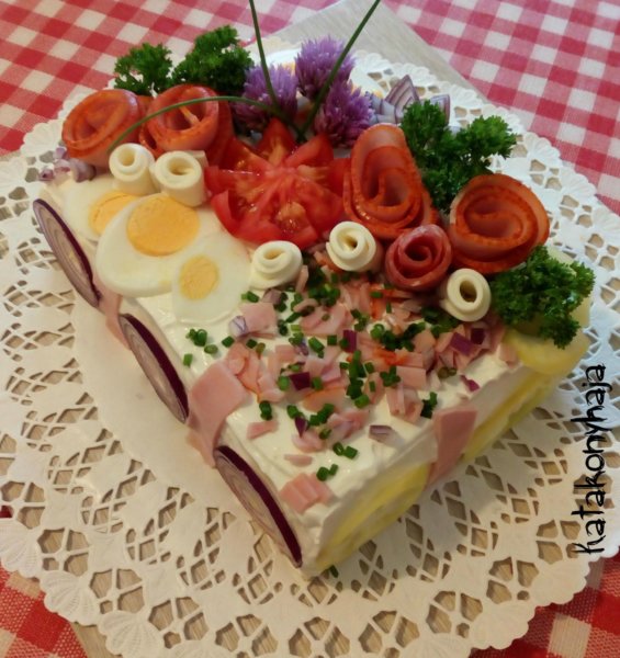 Ez egy szülinapi torta sós változatban. Nagy sikert aratott.